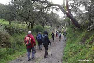...Continuando nosotros la marcha ahora, a campo abierto, por el Camino de Galaroza a Castaño Bajo. También conocido como camino del Tortero, sale por la calle Abajo, deja a la derecha el viejo cementerio y luego el hotel Galaroza Sierra. Cruza la carretera N-433 y pasa junto a la antigua fuente de la Salud, en los Molinos. Deja atrás la estación depuradora de aguas, cruza el río Múrtigas, abandona el T.M. de Galaroza, entrando en el de Jabugo y llega al cruce hacia Castaño Bajo o Jabugo. Tomando nosotros allí el camino de la derecha: prosiguiendo con el Camino de Galaroza a Jabugo, ya que en esta última localidad teníamos los coches estacionados.